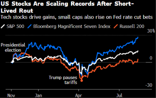 在此背景下,标普500指数重回纪录高位,强劲的企业盈利凸显了广泛出口税措施的有限影响。该基准指数自4月低点以来已飙升近30%——当时特朗普的贸易冲击引发了资金从美国资产中撤离。该指数自特朗普11月胜选以来也上涨了近12%。